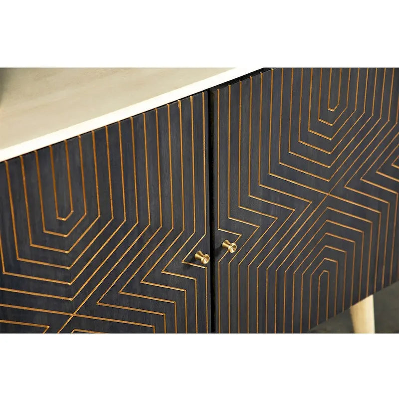 Make for an unexpected display with this incredible accent table. Crafted in India from solid mango wood, it's gold geometric pattern forms an eye-catching diamond design on each cabinet door against a black finish. Meanwhile, the stark white finish of the frame creates an exceptional contrast. Rounded angled legs make for a mid-century modern appeal.