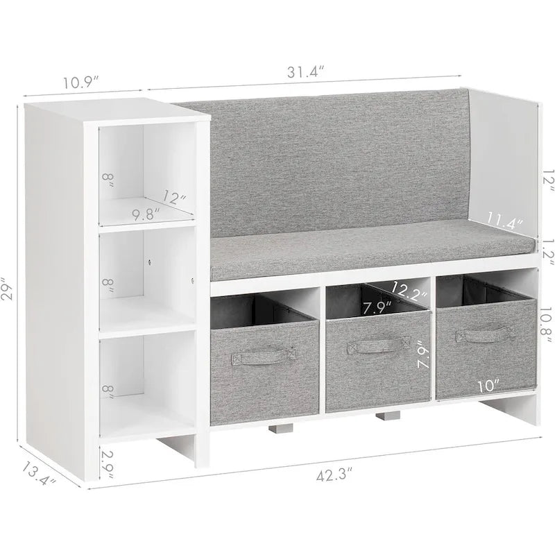 Effortless Assembly & Premium Support: Our nook bench with a bookshelf for kids' rooms under the window comes with straightforward step-by-step instructions and numbered parts for easy assembly. With dimensions measuring 42.3 W x 13.4 D x 29 H, Back cushion - 30.7 L x 13.2 x 1.2 , Seat cushion - 30.7 L x 11.4 x 1.2 . We're committed to providing quality service every step of the way.