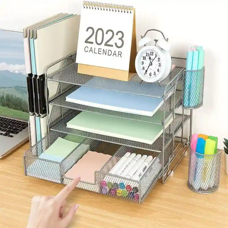 - The office desk organizers has built-in 4 trays, a file organizer rack, 2 pen holders and a sliding drawer, which can help you quickly identify the storage content of each compartment, and a clean desktop makes you more creative.