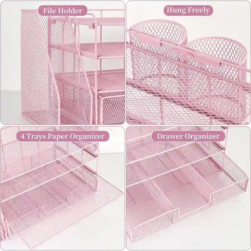 Metal Mesh Desk Organizer With 4 Trays, File Rack, Sliding Drawer & Pen Holders, Rust-Resistant, Tool-Free Assembly