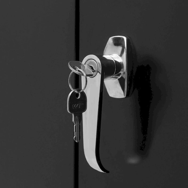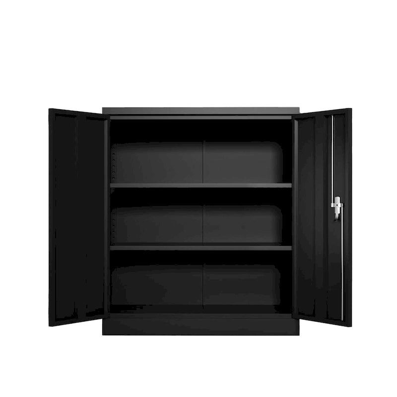 - This steel cabinet comes with 2 adjustable shelves to accommodate different storage needs. It can be locked to ensure the security of your valuables. Two keys are included.