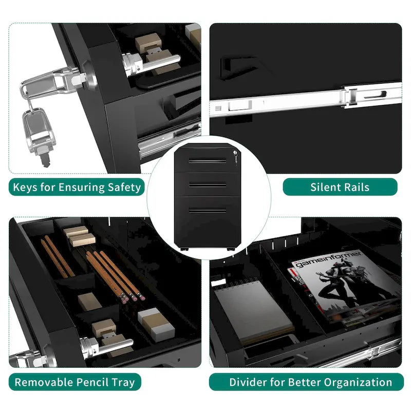 This polygonal frame mobile filing cabinet allows you to easily access your files anytime, anywhere. Three drawers provide ample storage space for office supplies, and dual casters allow you to easily move the filing cabinet under your desk or to other locations. The casters are lockable for added safety and stability.
