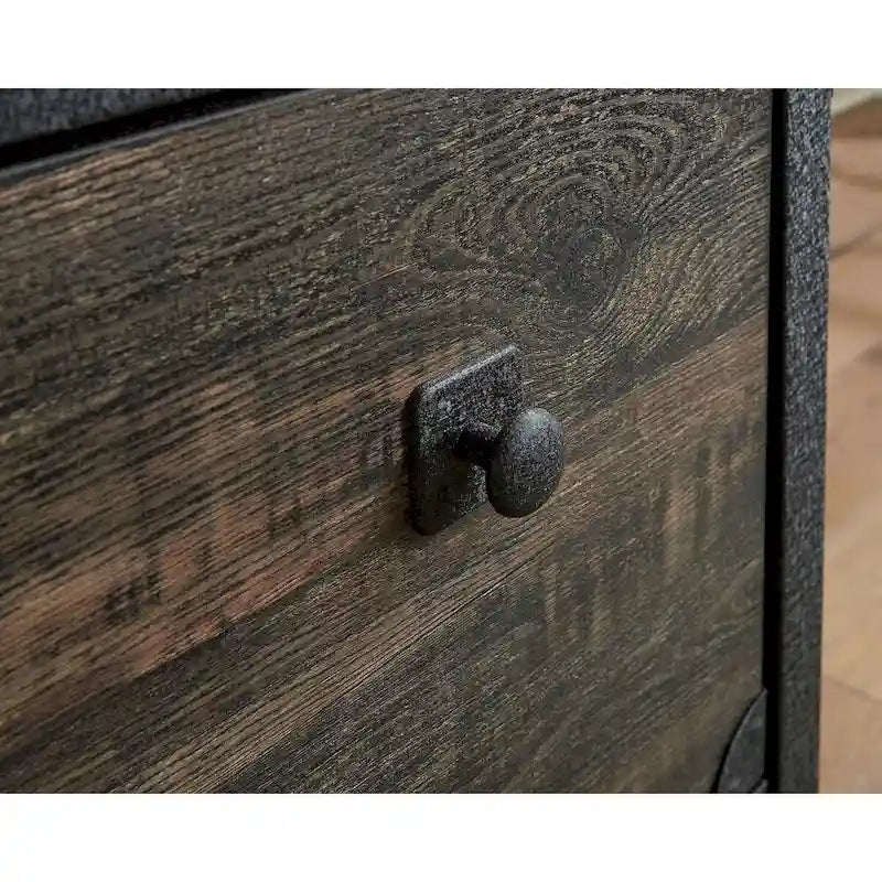 Keep your office or workspace organized and in style with this rustic lateral filing cabinet from the Steel River collection. This 2-drawer lateral file cabinet features two spacious file drawers that open and close on smooth full extension slides. The bottom drawer accommodates letter or legal-size hanging files so you can keep all your important files and papers organized and easily accessible. This industrial file cabinet also includes an interlocking safety mechanism that only allows one drawer to open at a time. The bottom drawer locks for secure storage of your most important files. A textured, powder coated metal frame and corner metal accents are the charming touches of design that make this wood lateral file cabinet stand out. This wood and metal lateral file cabinet is finished on all sides for versatile placement in any room of your home and looks great from any angle. Finished in Carbon Oak, this simply stunning file cabinet with metal framing adds style and functionality to your office or workspace.