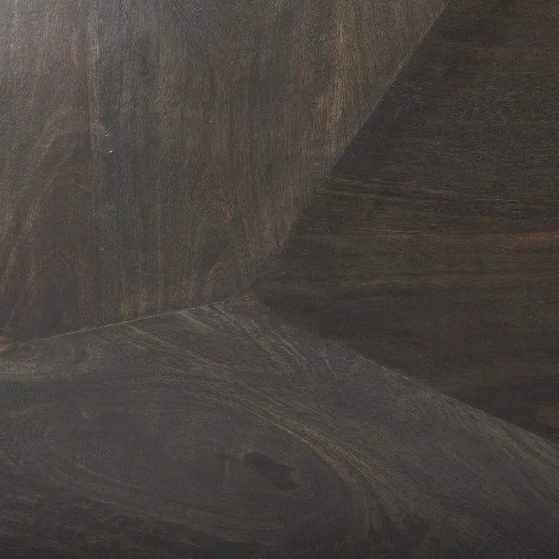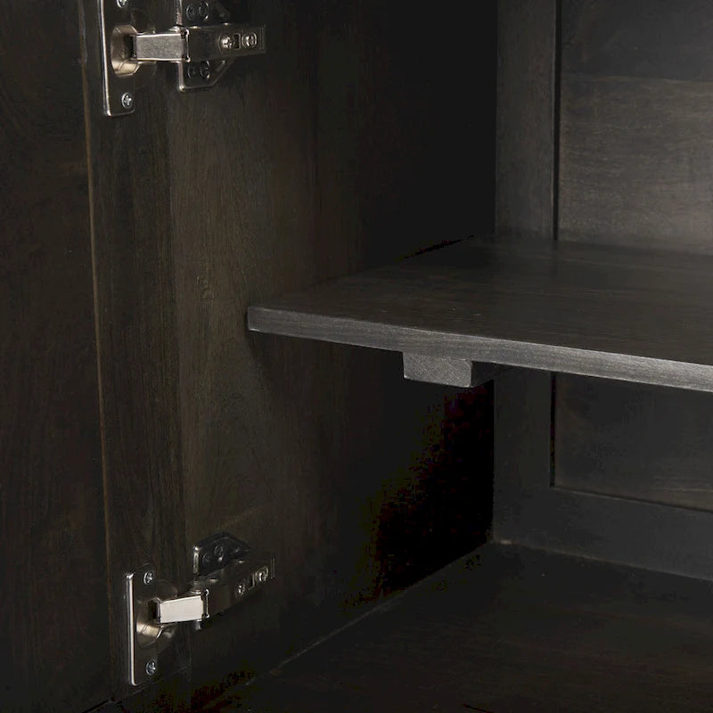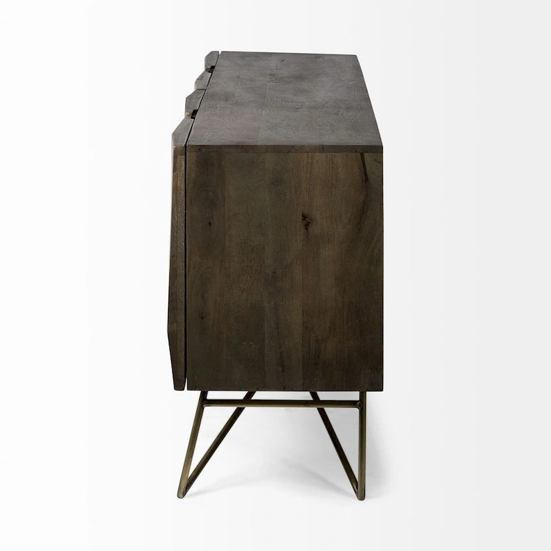 This sideboard, meticulously crafted from high-quality Indian mango wood and finished with a deep brown polish to highlight the wood's natural grain, is a stunning piece of furniture that will elevate the style of your space. In addition to a smooth countertop for displaying decorative items, the sideboard features four cabinets with removable shelves, providing ample storage space for everything from tableware and linens to accessories and china. Beyond its exceptional functionality, the sideboard boasts a high-quality polished finish and geometric raised patterns on the cabinet doors, making it a striking focal point in any room. Supported by a sturdy gold four-legged iron base, this antique sideboard is durable, functional, and aesthetically pleasing, making it ideal for Woodlands and Mercana Modern design style spaces.