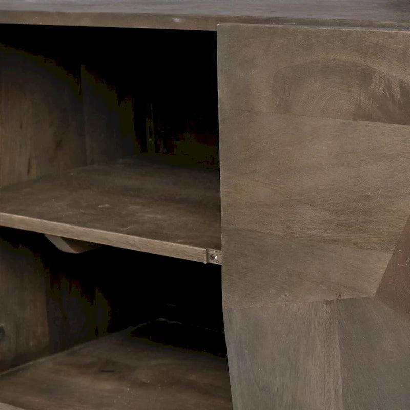 The four cabinet doors of this exquisite sideboard are adorned with intricate geometric raised patterns, making it a captivating focal point in any space or setting.