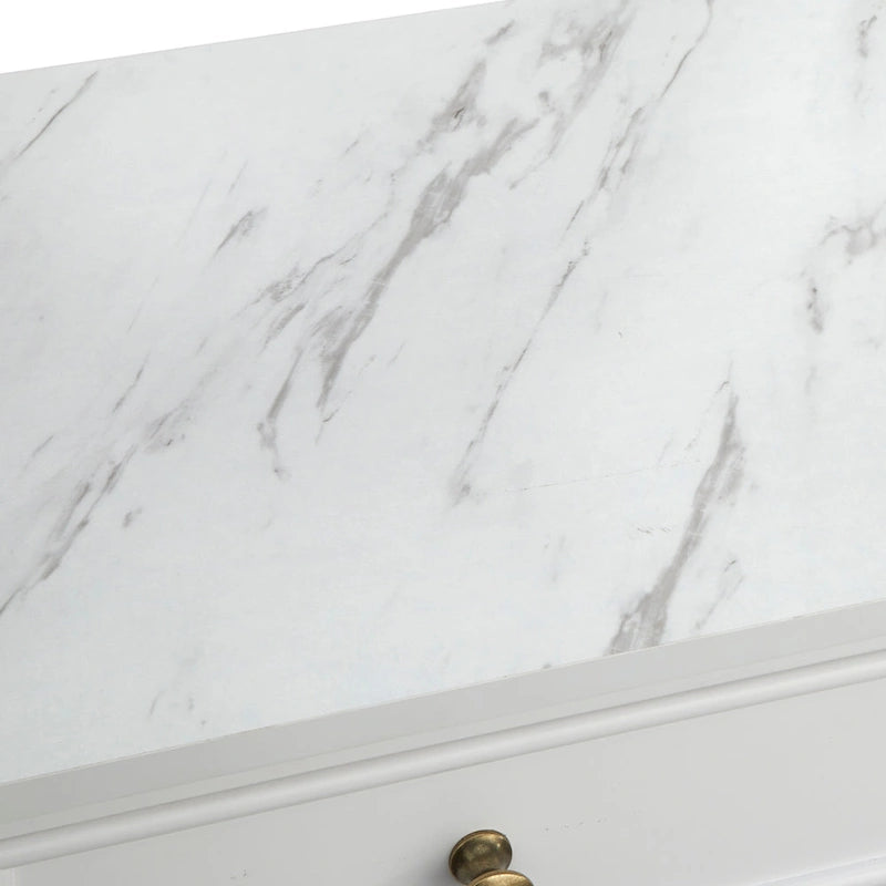 This storage cabinet is a stunning and versatile storage solution perfect for dining rooms, kitchens, or even home offices. Inspired by modern farmhouse style, it features a beautiful white finish and offers ample space for storing dinnerware or office supplies. A large drawer provides convenient storage for cutlery, utensils, or office essentials. The lower shelves offer additional space for plates, serving dishes, and cookware, or books, folders, and decorative items. The faux marble countertop adds a touch of sophistication while providing a durable work surface. Brass-finished knobs give the cabinet a high-end feel. Part of a modular furniture series (sold separately). Constructed from durable medium-density fiberboard (MDF).