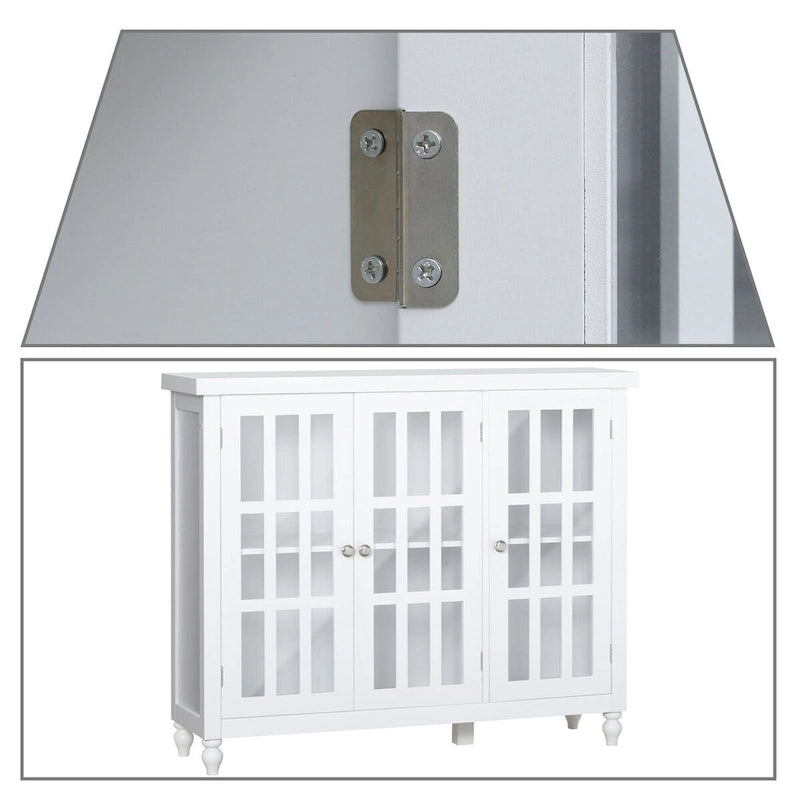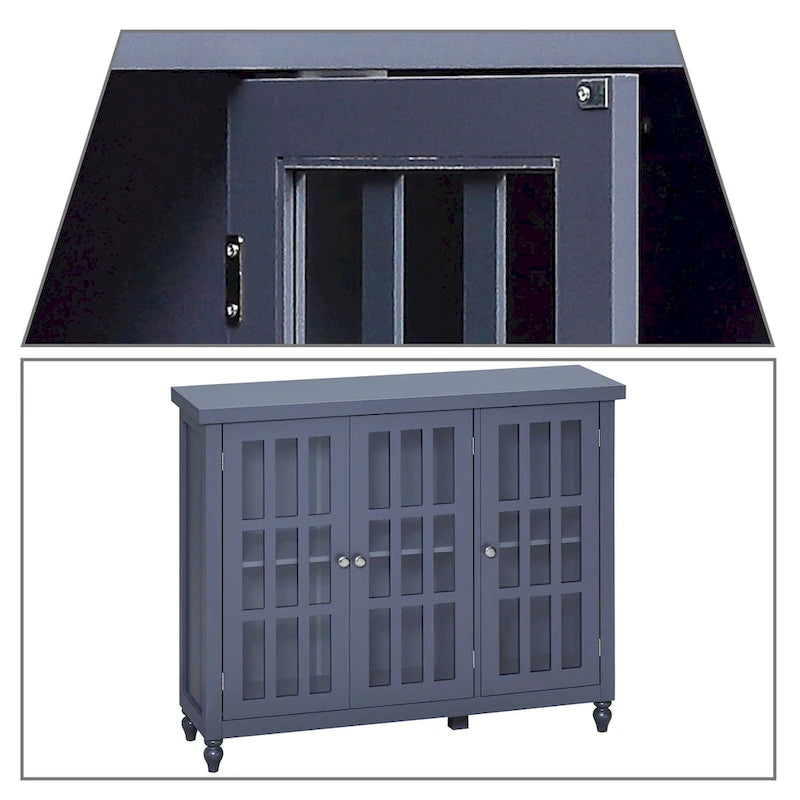 The minimalist design with three glass cabinet doors offers a clean, modern look that can enhance any room's decor. The glass doors not only protect contents but also allow you to display decorative items or easily view what's stored inside, making items accessible and reducing the need to open the cabinets frequently. This sideboard can serve multiple purposes, from a dining room buffet to a living room console or a hallway display cabinet, making it a versatile addition to any home.