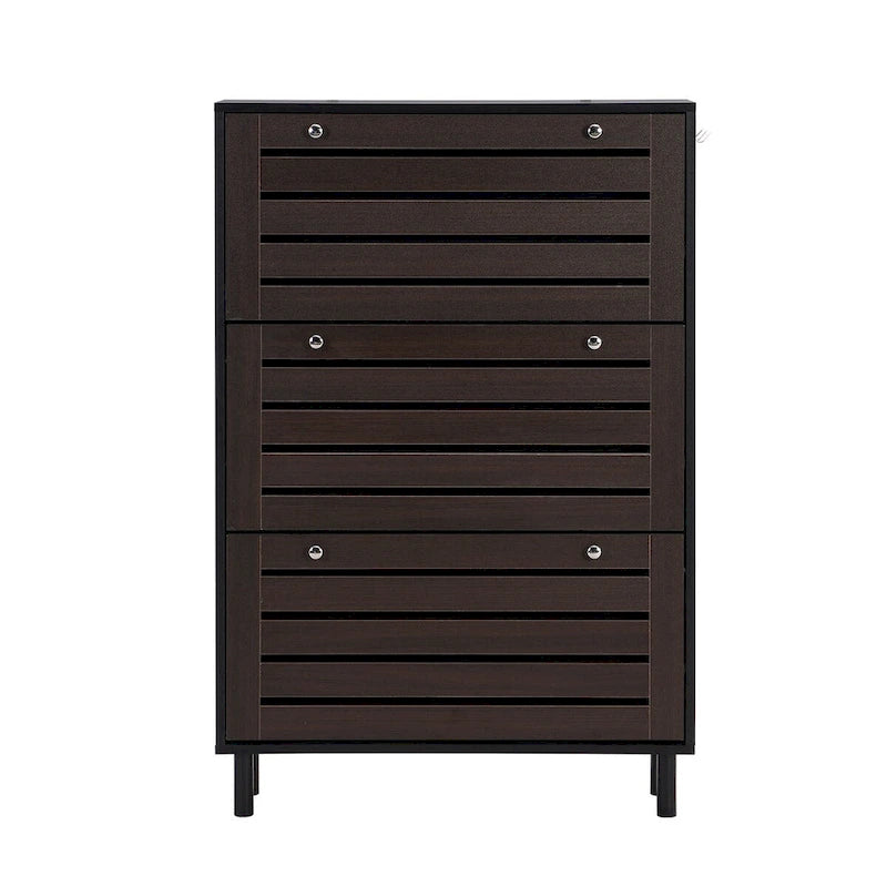 - Introducing our Minimalist Slim Shoe Cabinet, the perfect solution for organizing your entryway! Made from strong and sturdy particle board, this free-standing shoe rack has adjustable legs for easy setup on any surface. With slits design panels and hanging hooks, this cabinet can store all your shoes with ease. The cabinet features 3 flip drawers, each capable of holding multiple pairs of shoes. The dark brown wooden appearance of this shoe cabinet adds a touch of elegance to any home decor. Don't let clutter take over your entryway, get our Minimalist Slim Shoe Cabinet today and store your shoes easily and stylishly!