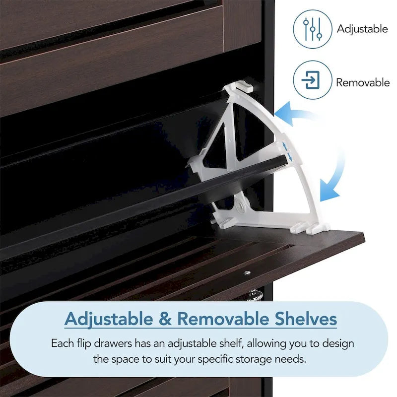 [Adjustable & Removable Shelves] Each flip drawers comes with an adjustable shelf, which allows you to customize the space to suit your specific storage needs. Whether you want to adjust the shelf to accommodate larger shoes or create extra storage space for smaller items, this cabinet is designed to make it easy for you. The shelves are sturdy, ensuring that your items are safely stored.