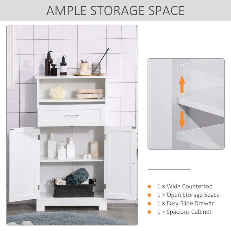 Still struggling with insufficient storage space in your bathroom, kitchen, dining room, or entryway? This floor-standing storage cabinet features a spacious countertop, a drawer, an open storage compartment, and a large cabinet with adjustable shelves, providing ample storage space. The simple geometric design allows this cabinet to seamlessly blend into your home decor. You can use it to store shampoo, body wash, kitchen supplies, tableware, or shoes. The high-quality MDF frame is sturdy and durable, and the waterproof surface is easy to clean.