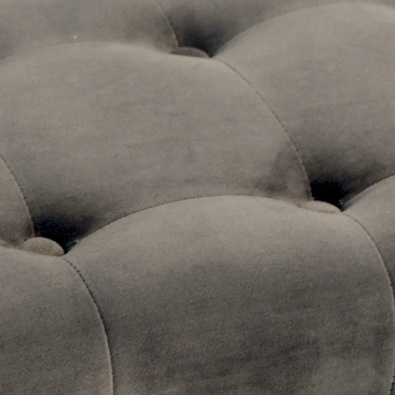 Padded bench with tufted detailing and storage shelf, charcoal gray.