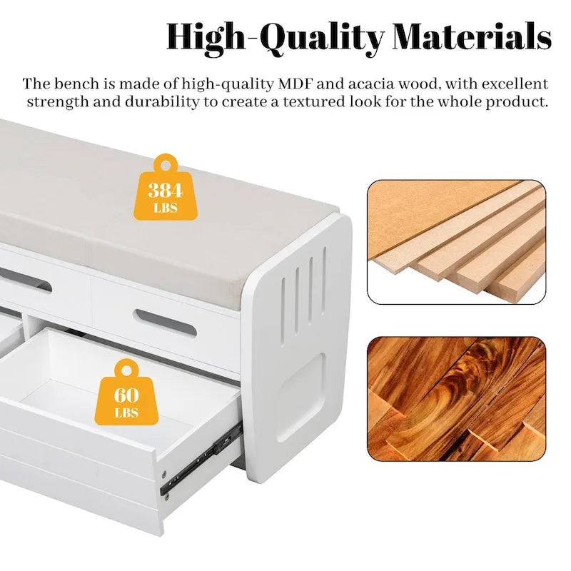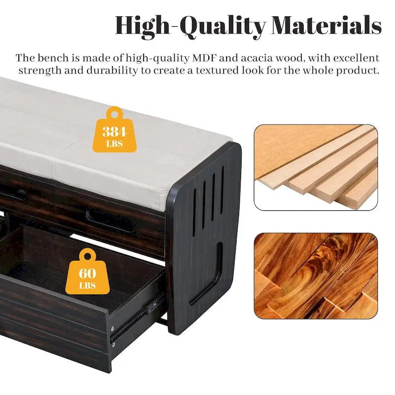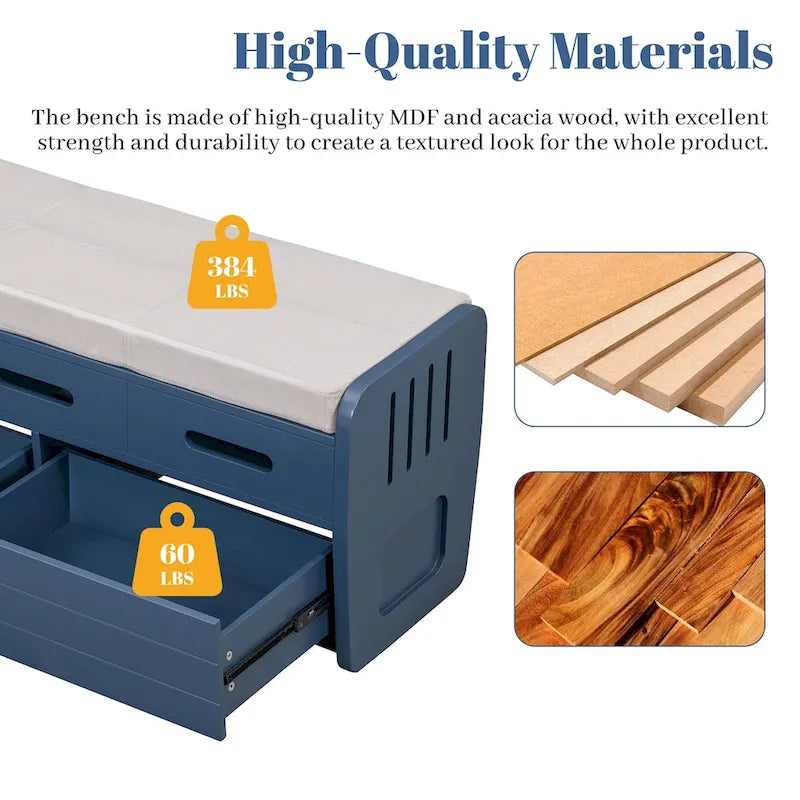 High-Quality Materials: The bench is made of high-quality MDF and acacia wood, to create a textured look for the whole product. The removable cushion provides a comfort for the storage bench. The material of the top and side panels is acacia wood, which has excellent strength and durability, rich and varied grains and colors, with unique artistic appeal and visual effect. Seat frame weight capacity: 384 LBS; Drawer weight capacity: 60LBS.