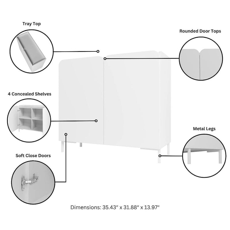 This mid-century modern style sideboard exudes a sophisticated modern feel with its clean, minimalist design. Its simple lines and monochromatic finish present a timeless and understated elegance, making it ideal for spaces seeking a refined modern aesthetic. This sideboard features two rounded cabinet doors with soft-close mechanisms and four fixed shelves inside.