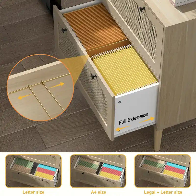 Bring rustic appeal to your workspace, the file cabinet with natural rattan detail on the drawer front. Crafted with MDF, sturdy solid wood legs and black metal knobs ensure long-term use. This lateral filing cabinet with two large drawers with adjustable hanging bars to accommodate legal, letter, and A4 size folders, perfect for keeping your files, documents and other office supplies organized. With full extension drawer slides, the file drawer can be fully opened, allowing you to easily access your files. This storage file cabinet is the perfect addition to any office or workspace.